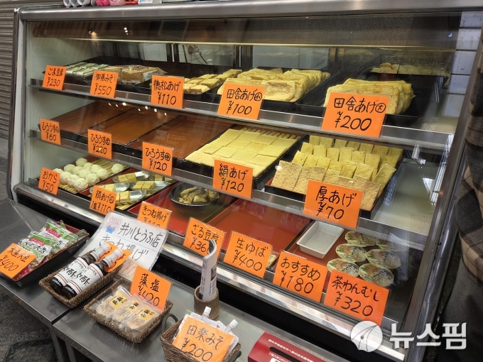 가장 먼저 찾은 곳은 아베노역과 텐노지역 사이, 여러 노선이 모이는 번화가 지하. 상업시설 '아베노베르타' 지하 식품 매장을 걷다 보면, 작은 두부 가게 '마루신'이 눈에 들어온다. 쇼케이스에는 '꿈(유메) 시리즈'라는 이름의 두부들이 줄지어 진열돼 있었다.