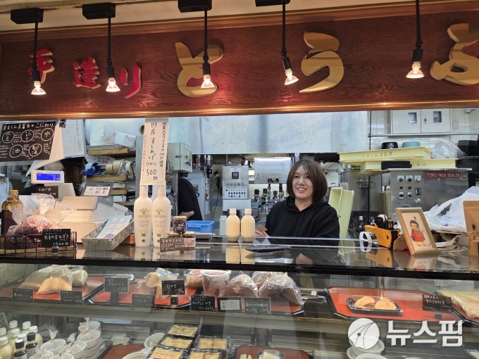[오사카=뉴스핌] 김기랑 기자 = 일본 오사카 내 두부가게 '마에다'에서 점주인 마에다씨가 사진 촬영에 응하고 있다. 2025.12.16 rang@newspim.com