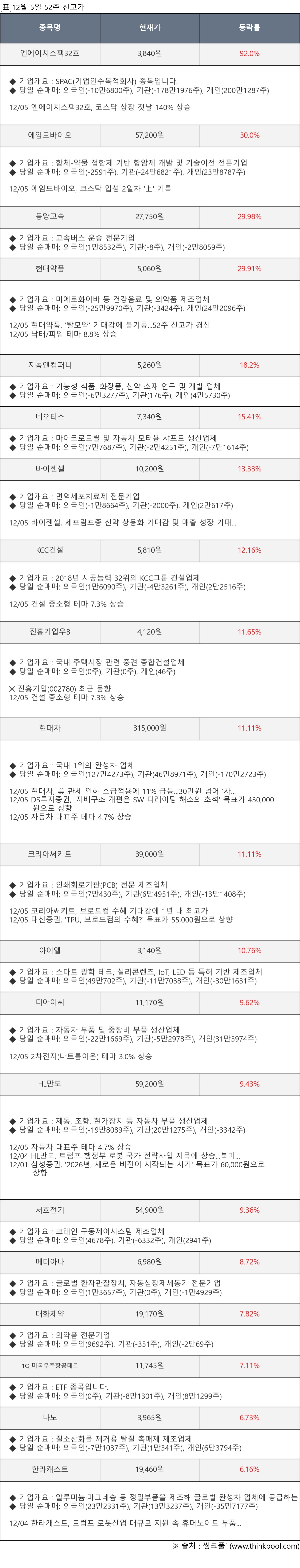 ※ 관련 종목: 엔에이치스팩32호, 에임드바이오, 동양고속, 현대약품, 지놈앤컴퍼니, 네오티스, 바이젠셀, KCC건설, 진흥기업우B, 현대차, 코리아써키트, 아이엘, 디아이씨, HL만도, 서호전기, 메디아나, 대화제약, 1Q 미국우주항공테크, 나노, 한라캐스트