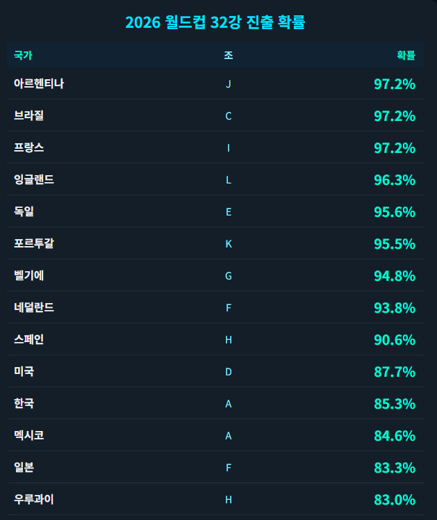 조 편성과 출전 확정 42개 팀 그리고 플레이오프를 통해 합류할 6개 팀은 중위권 전력으로 가정한 뒤, 간단한 레이팅과 승·무·패 확률을 적용해 조별리그를 2만 회 시뮬레이션했다. 그 결과 한국은 전체 시도 중 85.3%에서 32강에 진출했다. 멕시코(약 84.6%), 일본(83.3%), 우루과이(83.0%), 미국(87.7%)과 비슷한 수준으로 32강 진출이 유력한 그룹에 속하는 것으로 나타났다. 브라질·프랑스·아르헨티나가 97.2%로 가장 높았다. 잉글랜드·독일·포르투갈도 95% 전후의 높은 확률을 기록하며 조별리그 탈락 가능성이 거의 없는 팀으로 분류됐다.