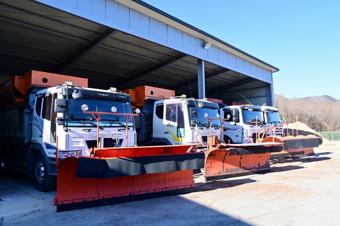 또 취약 지인 덕천지구·피나무재·천천지구에 설치된 염수 분사 시설 3개소와 제설작업에 투입될 1t 포터 10대, 2.5t 트럭 1대, 15t 덤프트럭 4대, 트랙터 51대, 제설 삽날, 모래 살포기 등 제설 장비 사전 점검도 완료했다.