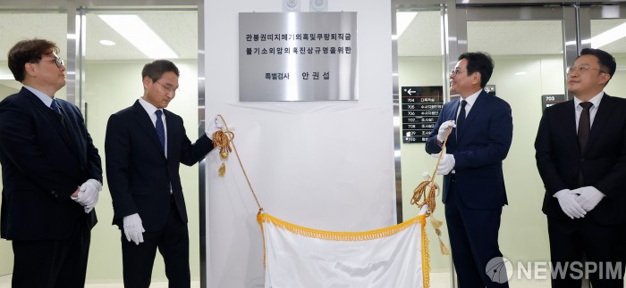 [서울=뉴스핌] 류기찬 기자 = 안권섭 특검을 비롯한 관계자들이 6일 오전 서울 서초구에 마련된 특검 사무실에서 현판을 제막하고 있다. 왼쪽부터 김호경 수사지원단장, 안 특검, 김기욱 특검보, 권도형 특검보. 2025.12.06 ryuchan0925@newspim.com