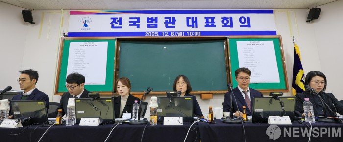 [고양=뉴스핌] 김학선 기자 = 법관대표회의 의장을 맡은 김예영 서울남부지법 부장판사가 8일 오전 경기 고양시 일산 사법연수원에서 열린 전국법관대표회의를 주재하고 있다. 이날 전국 법관 대표들은 내란전담 재판부 설치와 법왜곡죄 도입 등 여당이 추진하는 사법개혁안에 대해 공식 입장을 표명할 지 등에 대해 논의한다. 2025.12.08 yooksa@newspim.com