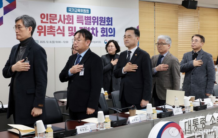 [서울=뉴스핌] 이길동 기자 =차정인 국가교육위원회 위원장이 8일 서울 종로구 정부서울청사에서 열린 인문사회 특별위원회 위촉식 및 제1차 회의에서 참석자들과 국기에 경례하고 있다.2025.12.08 gdlee@newspim.com