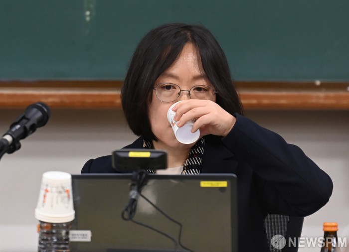 [고양=뉴스핌] 김학선 기자 = 전국법관대표회의 의장인 김예영 서울남부지법 부장판사가 8일 오전 경기 고양시 사법연수원에서 열린 2025년 하반기 전국법관대표회의 정기회의에서 목을 축이고 있다. 2025.12.08 yooksa@newspim.com