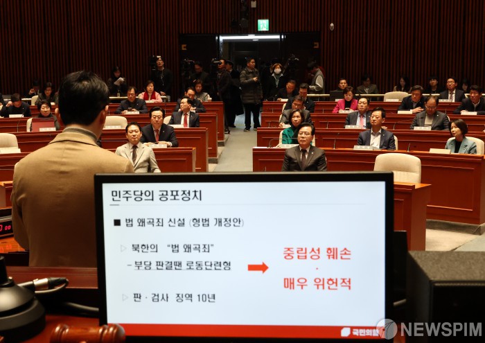 [서울=뉴스핌] 최지환 기자 = 주진우 국민의힘 의원이 8일 오전 서울 여의도 국회에서 열린 의원총회 및 이재명 정권 독재악법 국민고발회에서 '공포정치·정치보복 법안'을 발표하고 있다. 2025.12.08 choipix16@newspim.com