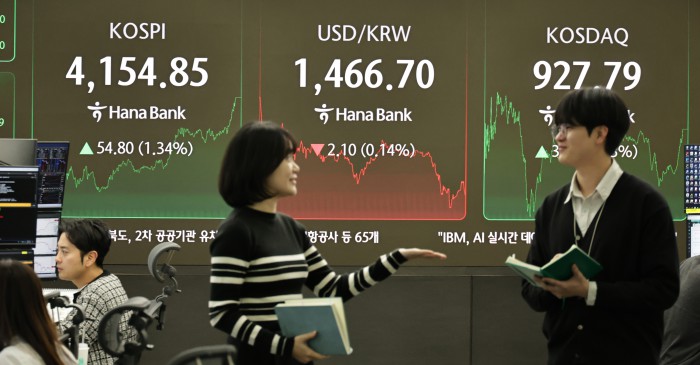 | [서울=뉴스핌] 양윤모 기자 = 8일 오후 코스피가 전장 종가보다 54.80 포인트(1.34%) 상승하며 4154.85로, 코스닥은 3.05 포인트(0.33%) 상승한 927.79로 장을 마감한 가운데, 서울 중구 하나은행 딜링룸에서 직원들이 업무를 보고 있다. 서울외환시장에서 달러/원 환율은 전장 대비 2.10원 하락한 1466.70원에 주간거래를 마감했다. 2025.12.08 yym58@newspim.com |