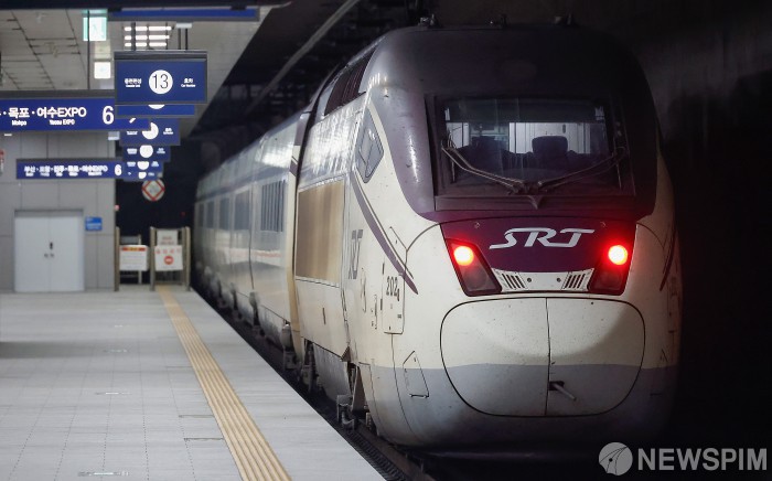 [서울=뉴스핌] 류기찬 기자 = 8일 오후 수서역에서 SRT 열차가 플렛폼을 나서고 있다. 국토교통부는 수서역 SRT의 좌석 부족 문제를 해결하기 위해 내년 3월부터 서울발 KTX와 수서발 SRT 교차 운행을 추진하기로 했다. 2025.12.08 ryuchan0925@newspim.com