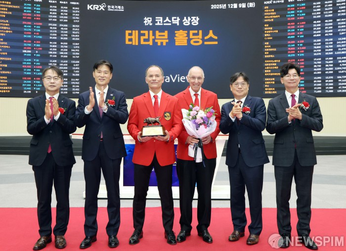 [서울=뉴스핌] 돈 아논 테라뷰홀딩스 대표이사가 9일 서울 영등포구 한국거래소에서 열린 테라뷰홀딩스 코스닥시장 상장기념식에서 상장기념패를 전달받은 뒤 기념촬영을 하고 있다. 왼쪽부터 김대영 한국IR협의회 부회장, 민경욱 한국거래소 코스닥시장본부장, 돈 아논 대표이사, 마이클 페퍼 CSO, 이충훈 삼성증권 부사장, 김준만 코스닥협회 전무. [사진=한국거래소] 2025.12.09 photo@newspim.com