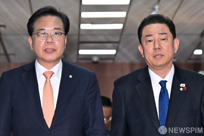 [서울=뉴스핌] 정일구 기자 = 김병기 더불어민주당 원내대표와 송언석 국민의힘 원내대표가 9일 서울 여의도 국회에서 우원식 국회의장 주재 회동을 마치고 이동하고 있다. 2025.12.09 mironj19@newspim.com