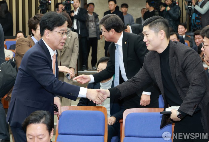 [서울=뉴스핌] 김학선 기자 = 송언석 국민의힘 원내대표가 9일 오후 서울 여의도 국회에서 열린 의원총회에 참석하며 김재섭 의원과 인사를 하고 있다. 2025.12.09 yooksa@newspim.com