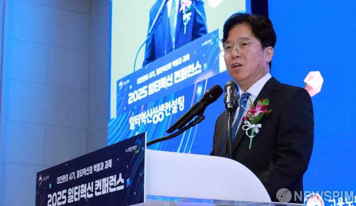 [서울=뉴스핌] 김영훈 고용노동부 장관이 9일 서울 마포구 중소기업DMC타워에서 열린 2025년 일터혁신 컨퍼런스에서 격려사를 하고 있다. 이번 행사는 현장에서의 실제 일터혁신 성과사례를 공유·확산하고 대전환 시대의 노동시장 변화에 대응할 수 있는 전략을 모색하기 위해 마련됐다. [사진=고용노동부] 2025.12.09 photo@newspim.com