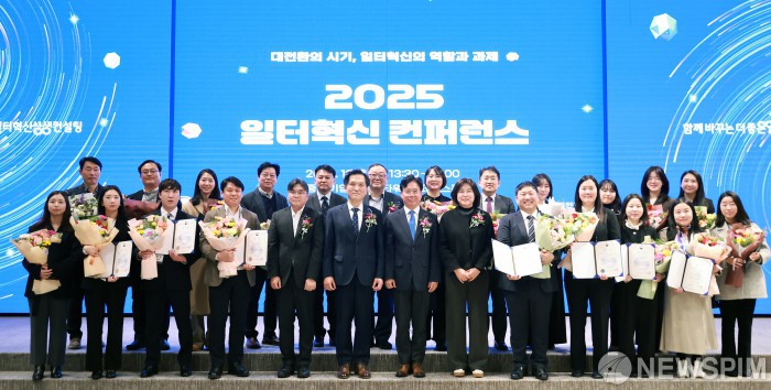[서울=뉴스핌] 김영훈 고용노동부 장관이 9일 서울 마포구 중소기업DMC타워에서 열린 2025년 일터혁신 컨퍼런스에서 내빈을 비롯한 수상자들과 기념촬영을 하고 있다. 이번 행사는 현장에서의 실제 일터혁신 성과사례를 공유·확산하고 대전환 시대의 노동시장 변화에 대응할 수 있는 전략을 모색하기 위해 마련됐다. [사진=고용노동부] 2025.12.09 photo@newspim.com