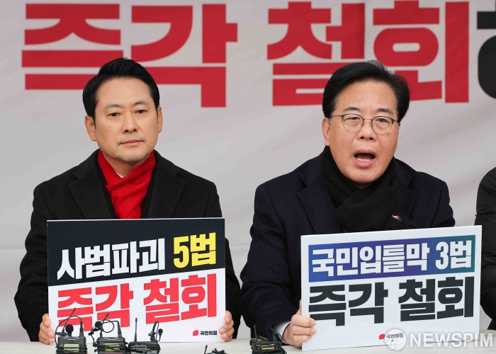 [서울=뉴스핌] 윤창빈 기자 = 송언석 국민의힘 원내대표가 10일 서울 여의도 국회본청앞에 마련된 ‘8대 악법 저지’ 농성장에서 발언하고 있다. 2025.12.10 pangbin@newspim.com