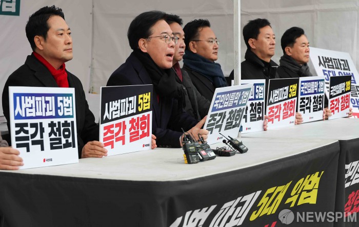 [서울=뉴스핌] 윤창빈 기자 = 송언석 국민의힘 원내대표가 10일 서울 여의도 국회본청앞에 마련된 ‘8대 악법 저지’ 농성장에서 발언하고 있다. 2025.12.10 pangbin@newspim.com