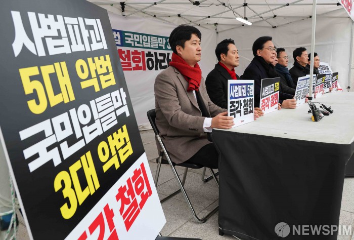 [서울=뉴스핌] 윤창빈 기자 = 장동혁 국민의힘 대표, 송언석 원내대표 등 당직자들이 10일 서울 여의도 국회본청앞에 마련된 ‘8대 악법 저지’ 농성장에서 피켓을 들고 있다. 2025.12.10 pangbin@newspim.com