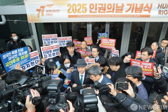 [서울=뉴스핌] 류기찬 기자 = 안창호 국가인권위원회 위원장이 10일 서울 중구 안중근 의사 기념관에서 열린 인권의날 기념행사에 참석하던 도중 국가인권위원회 바로잡기 공동행동에 가로막혀 돌아 나가고 있다. 2025.12.10 ryuchan0925@newspim.com