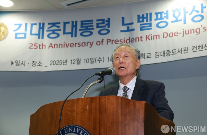 [서울=뉴스핌] 김학선 기자 = 권노갑 김대중재단 이사장이 10일 서울 마포구 연세대학교 김대중도서관에서 열린 김대중대통령 노벨평화상 수상 25주년 기념식에서 축사를 하고 있다. 2025.12.10 yooksa@newspim.com