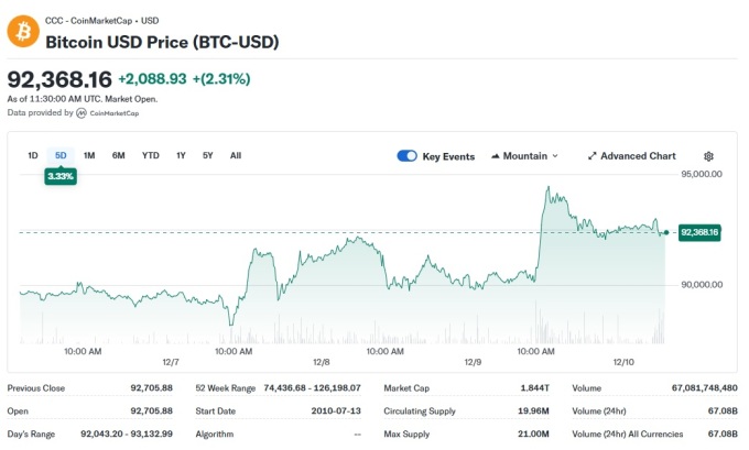 앞서 9일 한때 9만4000달러를 돌파한 비트코인(BTC)은 10일 아시아 시간대에 9만2500달러 수준으로 후퇴했으며, 한국 시간 오후 8시 25분 현재 24시간 전에 비해 2.1% 하락한 9만2334달러에 거래됐다