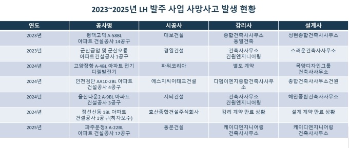 [서울=뉴스핌] 조수민 기자 = 최근 3년간 사망사고가 발생한 한국토지주택공사(LH) 발주 사업장 7곳 중 3곳에서 LH 전관이 소속된 설계·감리 업체가 참여한 것으로 확인됐다. 특히 2023년 인천 검단 지하주차장 붕괴 당시 전관업체로 지목됐던 동일 기업이 설계·감리를 맡은 현장만 3곳에 달했다.
