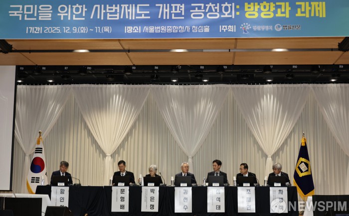 [서울=뉴스핌] 양윤모 기자 = 대법원 법원행정처가 11일 오전 서울 서초구 서울법원종합청사 청심홀에서 '국민을 위한 사법제도 개편 공청회' 3일차 종합토론을 개최했다. 토론회는 황인성 법원행정처 기획조정실 기획총괄심의관의 사회로 김선수 사법연수원 석좌교수(전 대법관), 문형배 전 헌법재판소장 권한대행, 박은정 이화여자대학교 법학전문대학원 명예교수, 심석태 세명대학교 저널리즘대학원 교수, 조재연 성균관대학교 법학전문대학원 석좌교수(전 대법관), 차병직 법률신문 편집인(법무법인 클라스한결 변호사)가 토론에 참여했다. 2025.12.11 yym58@newspim.com