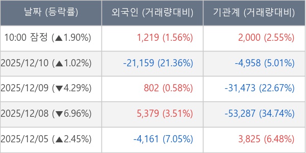 [서울=뉴스핌] 로보뉴스 = 11일 10시 15분 현재 티에프이(425420)는 외국인과 기관이 각각 0.12 만 주, 0.20 만 주 순매수(잠정) 하면서 전일 대비 1.90% (현재가 40,200원) 상승하고 있다.