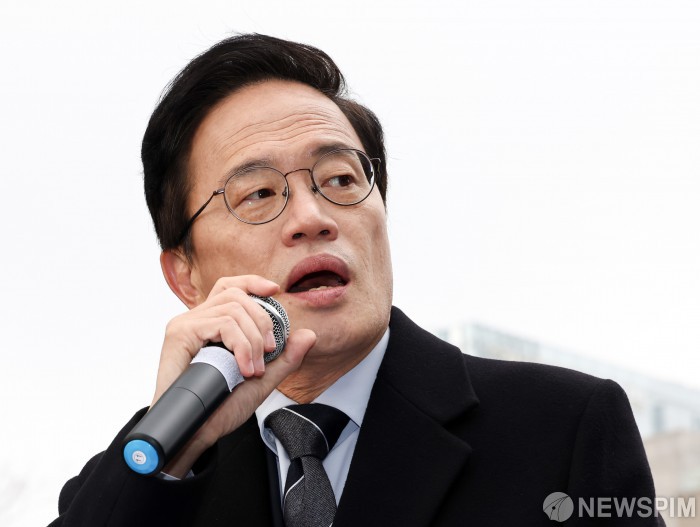 [서울=뉴스핌] 최지환 기자 = 박주민 더불어민주당 의원이 11일 오전 서울 종로구 광화문광장에서 서울시장 출마선언을 하고 있다. 2025.12.11 choipix16@newspim.com