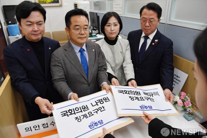[서울=뉴스핌] 정일구 기자 = 더불어민주당 김현정(왼쪽부터), 민병덕, 백승아, 문금주 의원이 11일 오후 서울 여의도 국회 의안과에 '국민의힘 나경원, 곽규택 의원 징계 요구안'을 제출하고 있다. 2025.12.11 mironj19@newspim.com