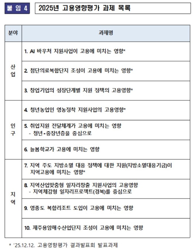 고용노동부와 한국노동연구원은 12일 서울 여의도 FKI타워에서 '2025년 고용영향평가 결과 발표회'를 열었다고 밝혔다.
