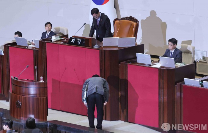 [서울=뉴스핌] 윤창빈 기자 = 곽규택 국민의힘 의원이 11일 서울 여의도 국회에서 열린 본회의에서 형사소송법 일부개정법률안(대안)에 대한 무제한 토론에 앞서 우원식 국회의장에게 인사하고 있다. 2025.12.11 pangbin@newspim.com