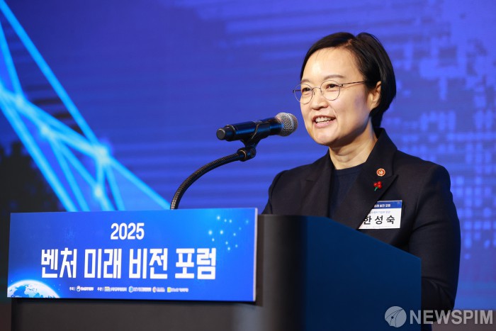 [서울=뉴스핌] 한성숙 중소벤처기업부 장관이 11일 서울 강남구 코엑스에서 열린 2025 벤처 미래 비전 포럼에서 개회사를 하고 있다. [사진=중소벤처기업부] 2025.12.11 photo@newspim.com