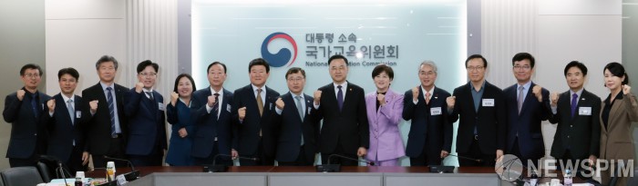 [서울=뉴스핌] 이길동 기자 =차정인 국가교육위원회 위원장(오른쪽에서 일곱번째)과 강은희 전국시도교육감협의회장(오른쪽에서 여섯번째)이 11일 서울 종로구 정부서울청사에서 열린 시·도교육감 간담회에서 참석한 시·도교육감들과 기념촬영을 발언하고 있다.2025.12.11 gdlee@newspim.com