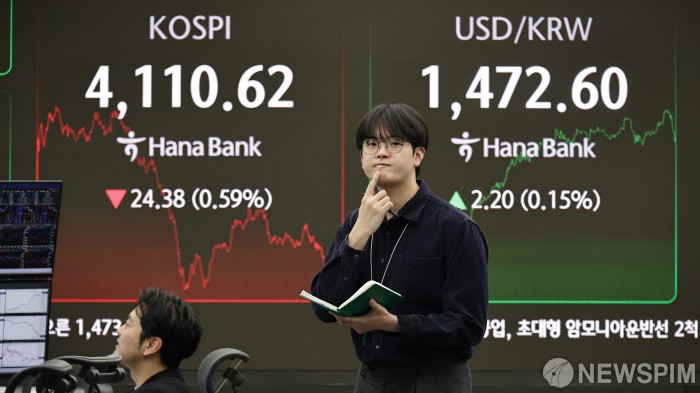 [서울=뉴스핌] 양윤모 기자 = 11일 오후 코스피가 전장 종가보다 24.38 포인트(0.59%) 하락하며 4110.62로, 코스닥은 0.36 포인트(0.04%) 하락한 934.64로 장을 마감한 가운데, 서울 중구 하나은행 딜링룸에서 직원들이 업무를 보고 있다. 서울외환시장에서 달러/원 환율은 전장 대비 2.20원 상승한 1472.60원에 주간거래를 마감했다. 2025.12.11 yym58@newspim.com