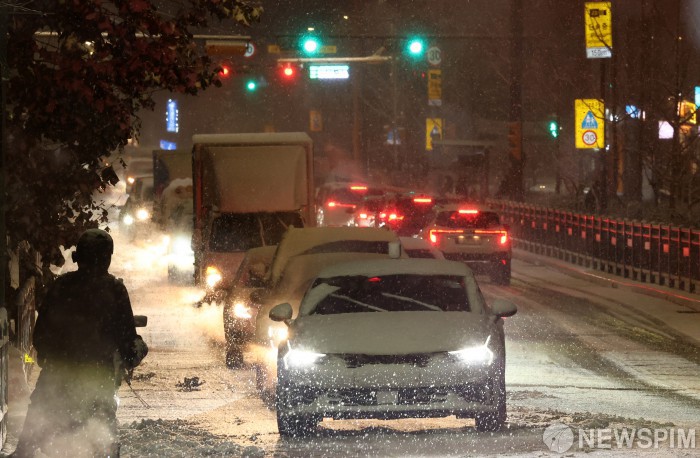 | [서울=뉴스핌] 최지환 기자 = 서울 전역에 대설주의보가 발효된 4일 밤 서울 은평구 한 주택가에서 눈길에 차량이 정체되고 있다. 2025.12.04 choipix16@newspim.com |