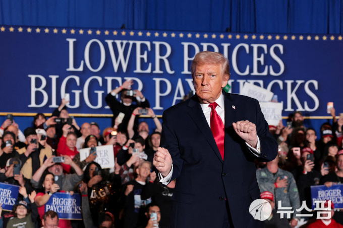도널드 트럼프 미국 대통령이 2025년 12월 9일 미국 펜실베이니아주 마운트 포코노에 위치한 마운트 에어리 카지노 리조트(Mount Airy Casino Resort)에 도착하여 미국 경제 및 물가 부담 능력(affordability)에 대한 연설을 하기 위해 제스처를 취하고 있다. [사진=로이터 뉴스핌]