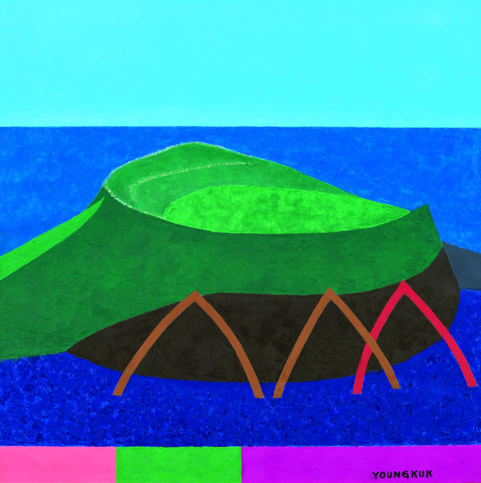 이번 경매의 표지작은 유영국의 작품 '워크(Work)'가 장식했다. 1984년에 제작된 이 작품은 작가의 후기 미학을 압축적으로 보여주는 수작으로, 하늘과 바다의 수평선 구조 위에 타원형의 분화구와 완만한 능선으로 단순화된 거대한 산이 하나의 색면처럼 자리하며 화면의 중심을 차지한다.
