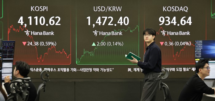 [서울=뉴스핌] 양윤모 기자 = 11일 오후 코스피가 전장 종가보다 24.38 포인트(0.59%) 하락하며 4110.62로, 코스닥은 0.36 포인트(0.04%) 하락한 934.64로 장을 마감한 가운데, 서울 중구 하나은행 딜링룸에서 직원들이 업무를 보고 있다. 서울외환시장에서 달러/원 환율은 전장 대비 2.00원 상승한 1472.40원에 주간거래를 마감했다. 2025.12.11 yym58@newspim.com