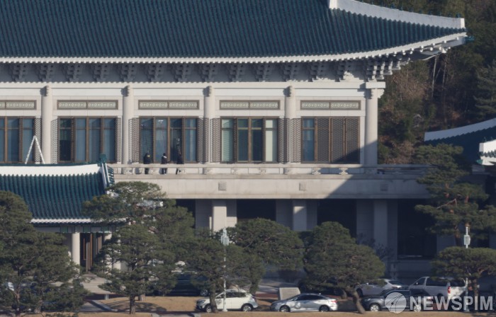 [서울=뉴스핌] 김학선 기자 = 대통령실이 용산 대통령 집무실을 청와대로 옮기는 작업을 본격적으로 시작한 가운데 12일 청와대 본관에서 관계자들이 유리창 청소를 하고 있다. 대통령실은 이번 달 말까지 청와대 이전을 마칠 예정이다. 2025.12.12 yooksa@newspim.com