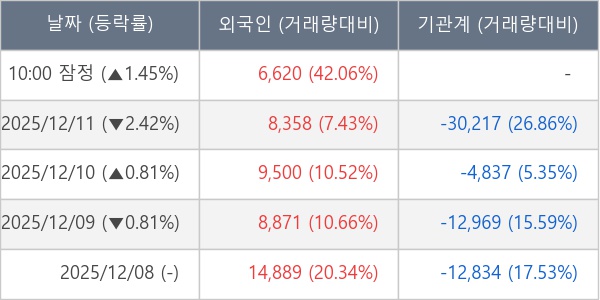 [서울=뉴스핌] 로보뉴스 = 12일 10시 15분 현재 크래프톤(259960)은 전일 대비 1.45% (현재가 245,000원) 상승했고, 외국인이 최근 9일 연속 순매수(누적 10.56만 주, 잠정) 행진을 하고 있다.