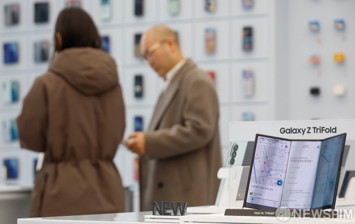 [서울=뉴스핌] 류기찬 기자 = 삼성전자의 두 번 접히는 '갤럭시 Z 트라이폴드' 첫 판매일인 12일 오전 서울 서초구 삼성 강남에 트라이폴드가 전시되어 있다. 2025.12.12 ryuchan0925@newspim.com