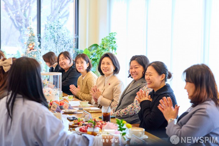 [서울=뉴스핌] 김혜경 여사가 지난 11일 충북 청주의 한 카페에서 ‘맘스캠프’ 회원들과 육아, 여성 일자리 등 현안관련 대화를 나누고 있다. [사진=대통령실] 2025.12.12 photo@newspim.com