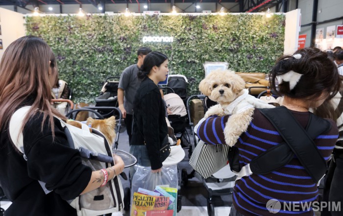 [서울=뉴스핌] 최지환 기자 = 12일 오후 서울 강남구 세텍에서 열린 크리스마스 서울 펫쇼에서 관람객들이 반려견과 함께 전시장을 둘러보고 있다. 2025.12.12 choipix16@newspim.com