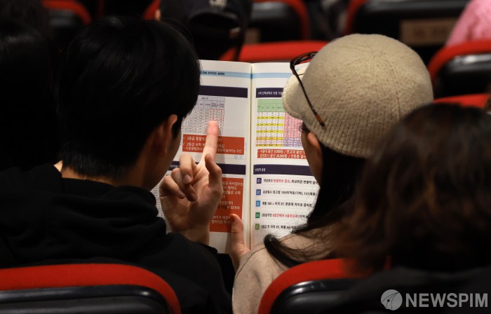 [서울=뉴스핌] 김학선 기자 = 13일 서울 성북구 고려대학교 인촌기념관에서 열린 2026 대입 정시모집 대비 진학지도 설명회에서 수험생과 학부모들이 자료집을 살펴보고 있다. 2025.12.13 yooksa@newspim.com