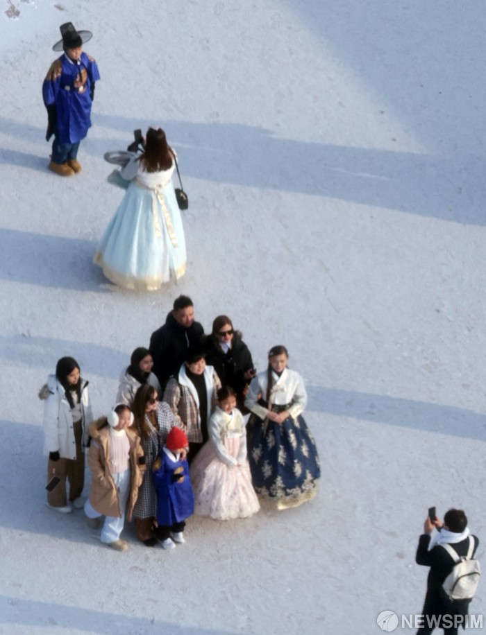 [서울=뉴스핌] 이길동 기자 = 14일 오전 서울 종로구 경복궁을 찾은 관광객들이 밤사이 내린 눈을 배경으로 사진을 찍고 있다. 2025.12.14 gdlee@newspim.com