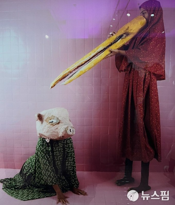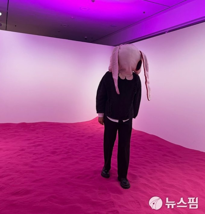 [서울=뉴스핌] 주마이리 '아랍어로, 쉼표'. 2019. 모래, 인터렉티브 사운드. 가변크기. 작가는 분홍색으로 물들인 모래로 전시장을 채운 뒤 관람객으로 하여금 분홍빛 사막을 걸어보도록 했다. 기이한 동물 가면을 쓴 작가가 시범을 보이고 있다. [사진=이영란 미술전문기자] 2025.12.16 art29@newspim.com