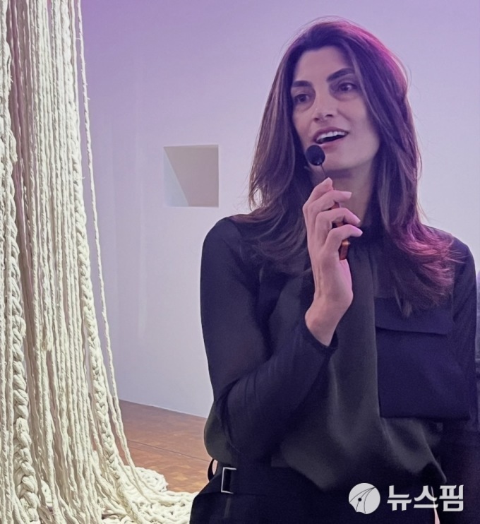 [서울=뉴스핌] 서울시립미술관 김은주 학예연구사와 함께 이번 '근접한 세계' 전을 공동기획한 아부다비음악예술재단의 마야 엘 칼릴 큐레이터. 레바논 출신으로 영국을 기반으로 활동해온 전시기획자다. [사진=이영란 미술전문기자] 2025.12.16 art29@newspim.com