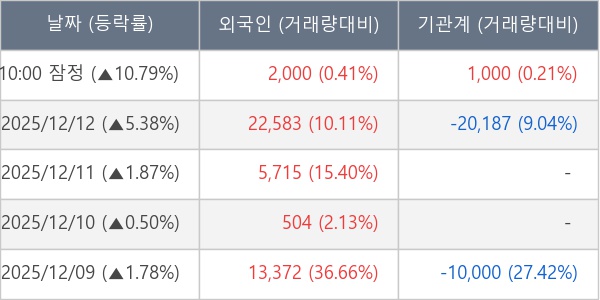 [서울=뉴스핌] 로보뉴스 = 15일 10시 15분 현재 컨텍(451760)은 전일 대비 10.79% (현재가 9,550원) 상승했고, 외국인이 최근 7일 연속 순매수(누적 52,052주, 잠정) 행진을 하고 있다.