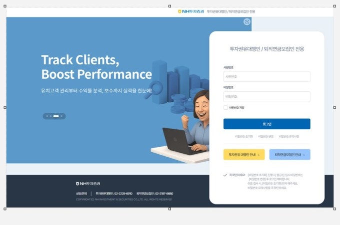 [서울=뉴스핌] 김가희 기자 = NH투자증권은 투자권유대행인과 퇴직연금모집인의 영업 및 관리 업무 효율화를 위해 전용 홈페이지를 구축하고 1차 서비스를 오픈한다고 15일 밝혔다.