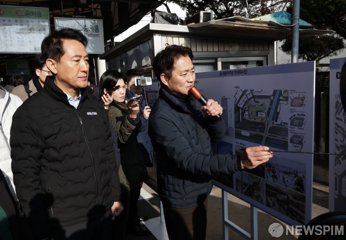 [서울=뉴스핌] 양윤모 기자 = 오세훈 서울시장이 15일 오전 광진구 구의동 동서울터미널을 방문 '동서울터미널 현대화사업' 개발대상지를 방문 신동우 신세계프라퍼티 본부장등이 참석한 가운데 관계자의 성명을 듣고 있다.동서울터미널 현대화사업은 동서울터미널 일대를 지하 7층∼지상 39층으로 2031년 완공을 목표로 민간사업자인 신세계프라퍼티가 주축인 신세계 동서울피에프브이(PFV)가 개발하는 사업이다. 2025.12.15 yym58@newspim.com