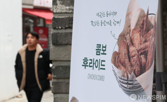 [서울=뉴스핌] 최지환 기자 = 정부가 상위 10대 치킨 프랜차이즈를 대상으로 매장 및 배달 주문 메뉴판에 조리 전 닭고기 무게를 고지해야 되는 '치킨 중량표시제'를 실시한 15일 서울 시내의 한 치킨매장 앞으로 시민들이 오가고 있다. 2025.12.15 choipix16@newspim.com